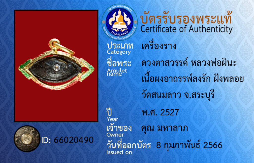 ชื่อพระ :ดวงตาสวรรค์ หลวงพ่อผินะ เนื้อผงอาถรรพ์ลงรัก ฝังพลอย วัดสนมลาว จ.สระบุรี
