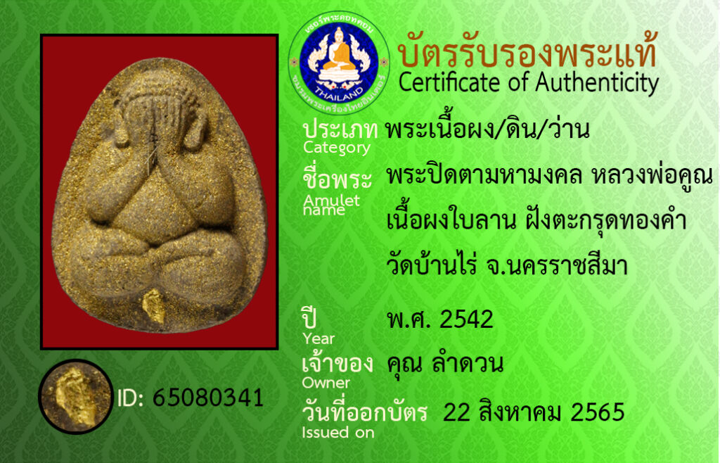 ชื่อพระ : พระปิดตามหามงคล หลวงพ่อคูณ เนื้อผงใบลาน ฝังตะกรุดทองคำ วัดบ้านไร่ จ.นครราชสีมา