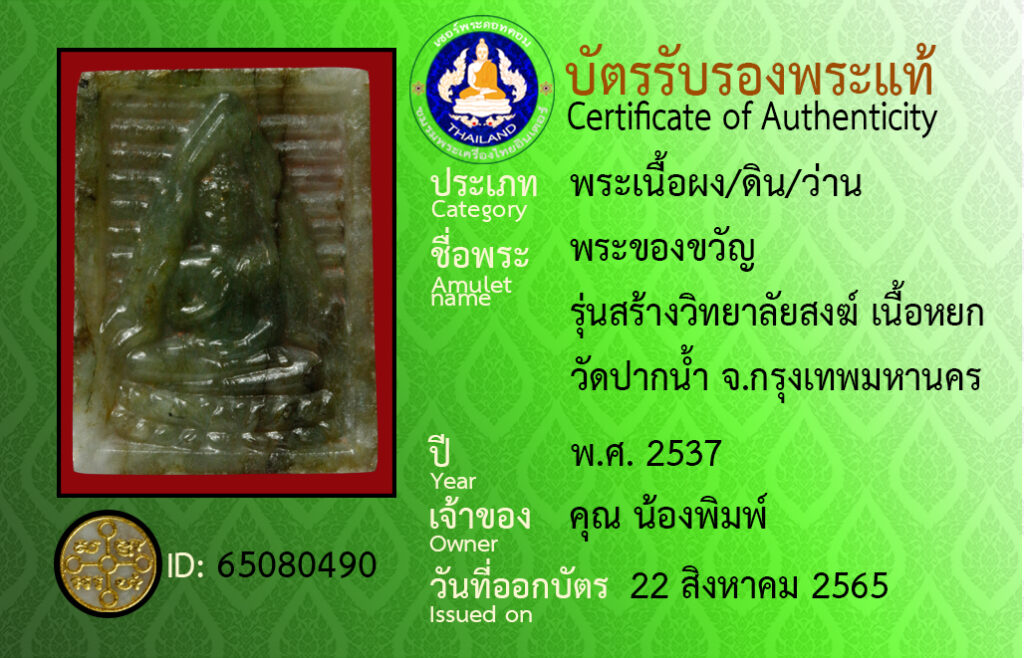 ชื่อพระ : พระของขวัญ รุ่นสร้างวิทยาลัยสงฆ์ เนื้อหยก วัดปากน้ำ จ.กรุงเทพมหานคร