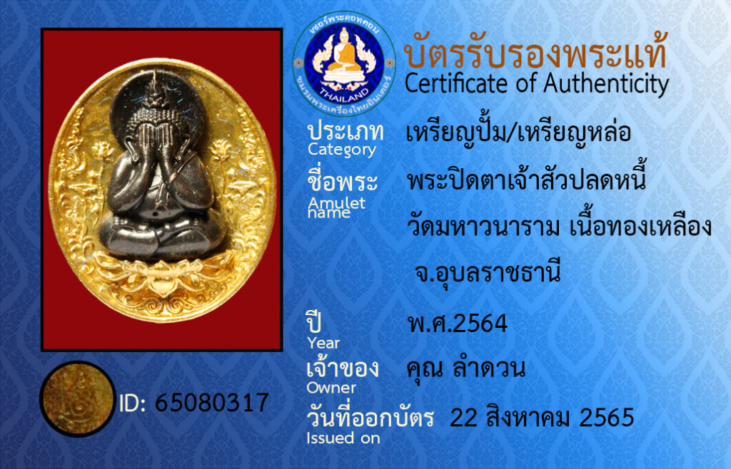 ชื่อพระ : พระปิดตาเจ้าสัวปลดหนี้ วัดมหาวนาราม เนื้อทองเหลือง จ.อุบลราชธานี
