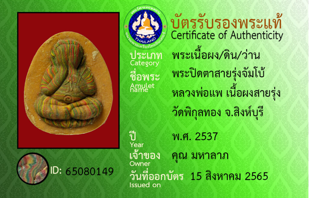 Amulet name : pra pidta sairung jambo luangpor pa watpikoontong