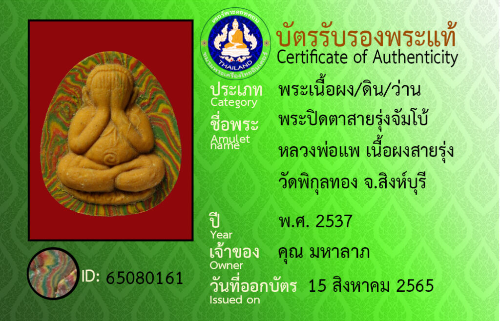 Amulet name : pra pidta sairung jambo luangpor pa watpikoontong