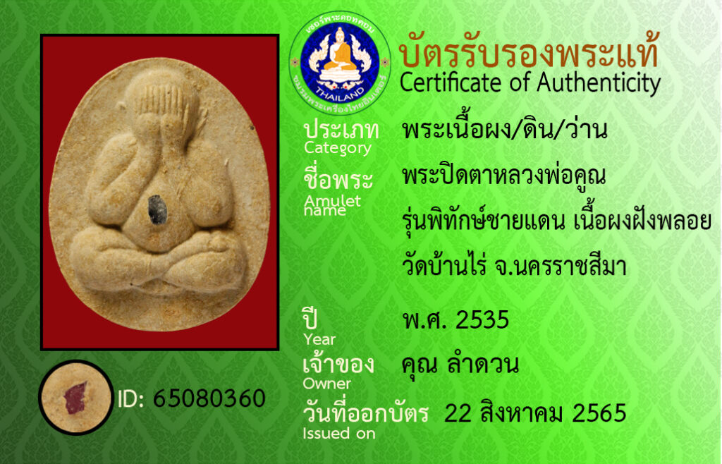 Amulet name : Phra Pit Ta Luang Pho Khun,Run Phithak Chaidaen,Wat Ban Rai, Nakhon Ratchasima