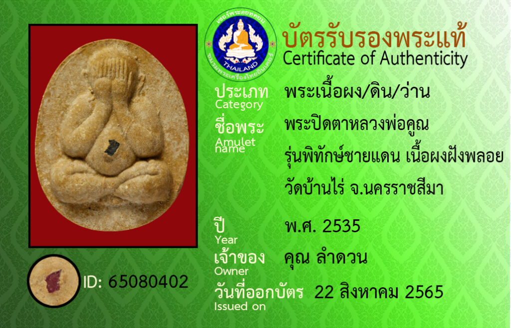Amulet name : Phra Pit Ta Luang Pho Khun,Run Phithak Chaidaen,Wat Ban Rai, Nakhon Ratchasima