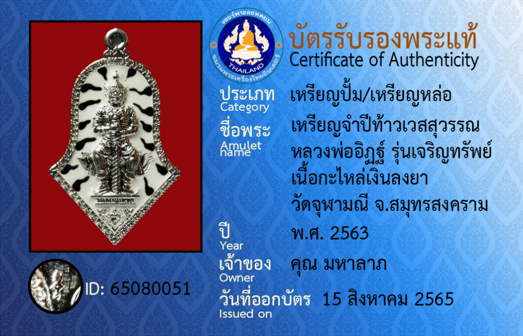 ชื่อพระ : เหรียญจำปีท้าวเวสสุวรรณ หลวงพ่ออิฏฐ์ รุ่นเจริญทรัพย์ เนื้อกะไหล่เงินลงยา วัดจุฬามณี จ.สมุทรสงคราม