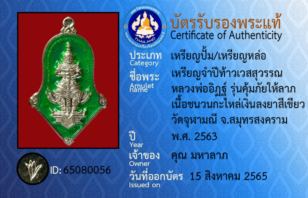 ชื่อพระ : เหรียญจำปีท้าวเวสสุวรรณ หลวงพ่ออิฏฐ์ รุ่นคุ้มภัยให้ลาภ เนื้อชนวนกะไหล่เงินลงยาสีเขียว วัดจุฬามณี จ.สมุทรสงคราม