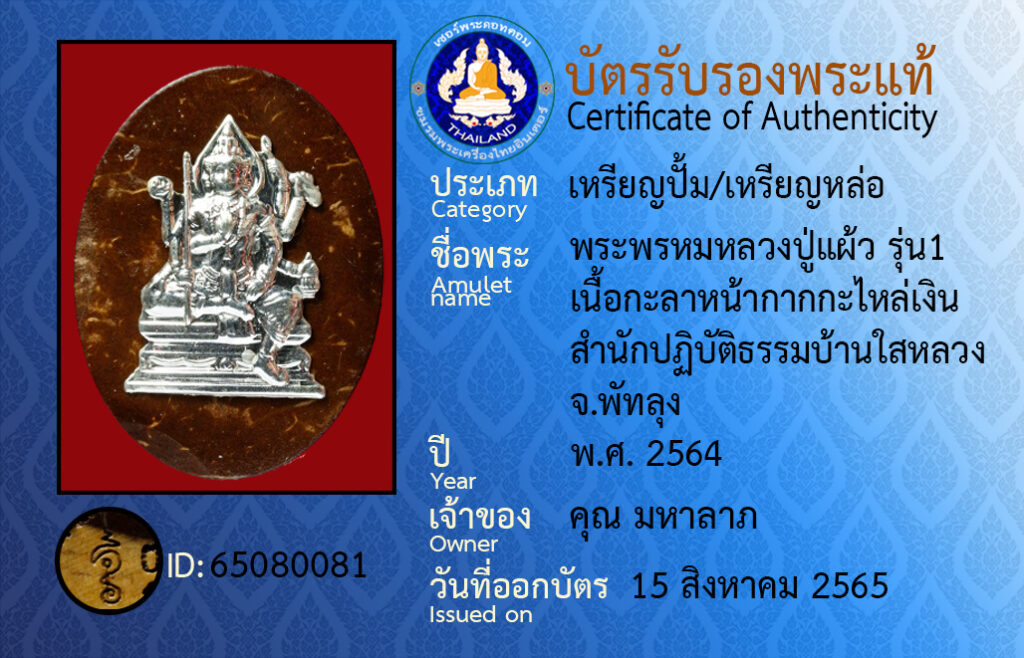 ชื่อพระ : พระพรหมหลวงปู่เเผ้ว รุ่น1 เนื้อกะลาหน้ากากกะไหล่เงิน สำนักปฏบัติธรรมบ้านใสหลวง จ.พัทลุง