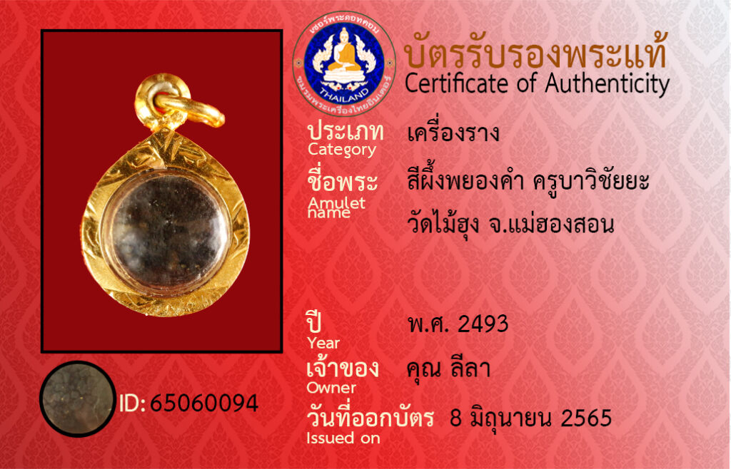 ชื่อพระ : สีผึ้งพยองคำ ครูบาวิชัยยะ วัดไม้ฮุง จ.แม่ฮองสอน