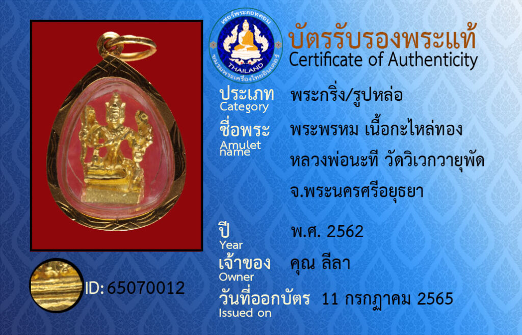 ชื่อพระ : พระพรหม เนื้อกะไหล่ทอง หลวงพ่อนะที วัดวิเวกวายุพัด จ.พระนครศรีอยุธยา