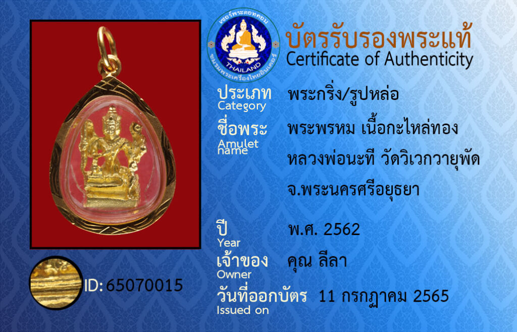 ชื่อพระ : พระพรหม เนื้อกะไหล่ทอง หลวงพ่อนะที วัดวิเวกวายุพัด จ.พระนครศรีอยุธยา