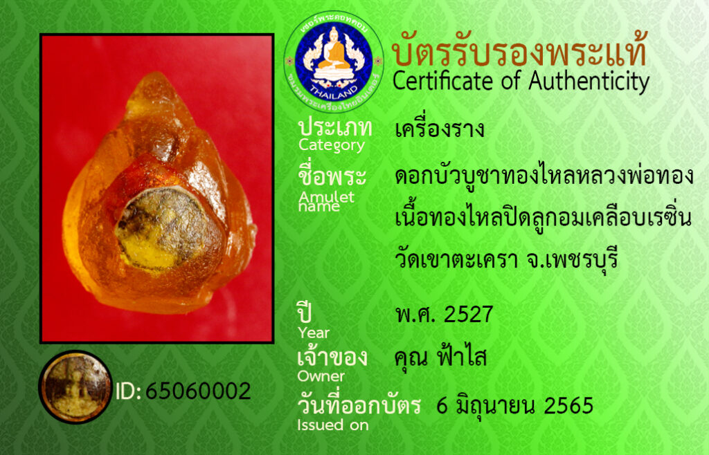 ชื่อพระ : ดอกบัวบูชาทองไหลหลวงพอทอง เนื้อทองไหลปิดลูกอมเคลือบเรซิ่น วัดเขาตะเครา จ.เพชรบุรี