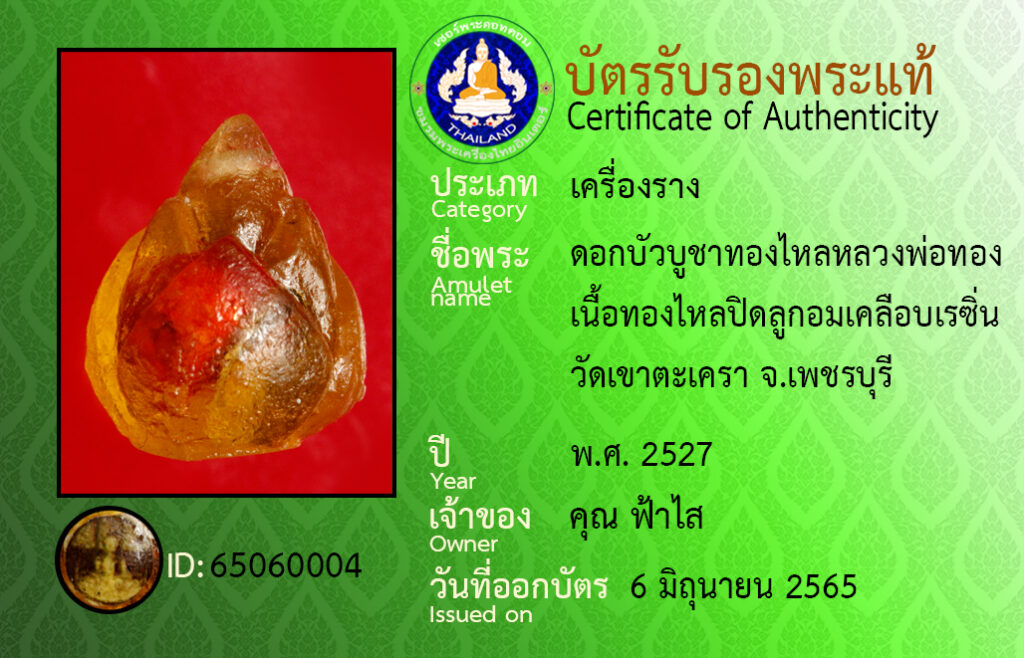 ชื่อพระ : ดอกบัวบูชาทองไหลหลวงพอทอง เนื้อทองไหลปิดลูกอมเคลือบเรซิ่น วัดเขาตะเครา จ.เพชรบุรี