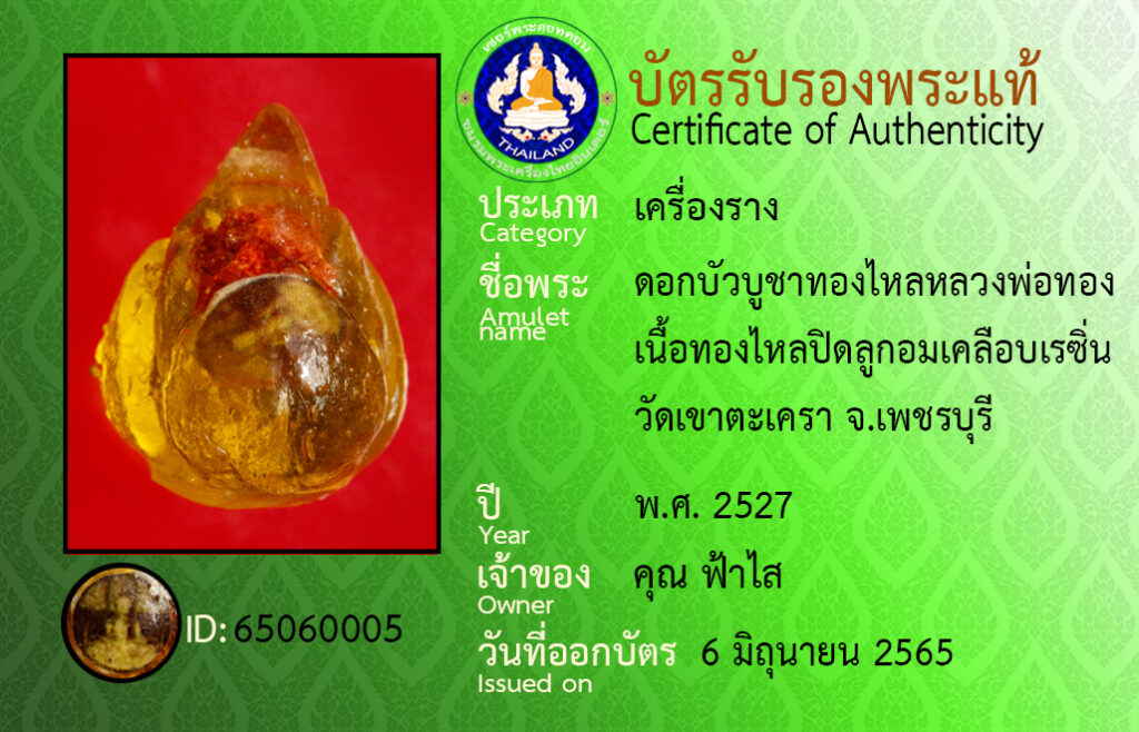 ชื่อพระ : ดอกบัวบูชาทองไหลหลวงพอทอง เนื้อทองไหลปิดลูกอมเคลือบเรซิ่น วัดเขาตะเครา จ.เพชรบุรี