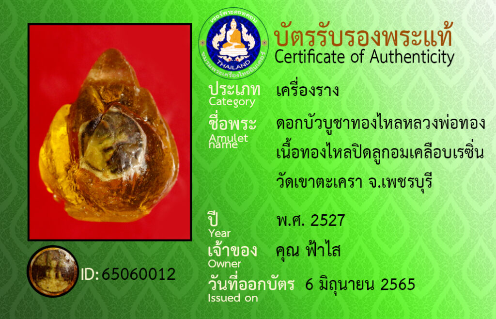 ชื่อพระ : ดอกบัวบูชาทองไหลหลวงพอทอง เนื้อทองไหลปิดลูกอมเคลือบเรซิ่น วัดเขาตะเครา จ.เพชรบุรี