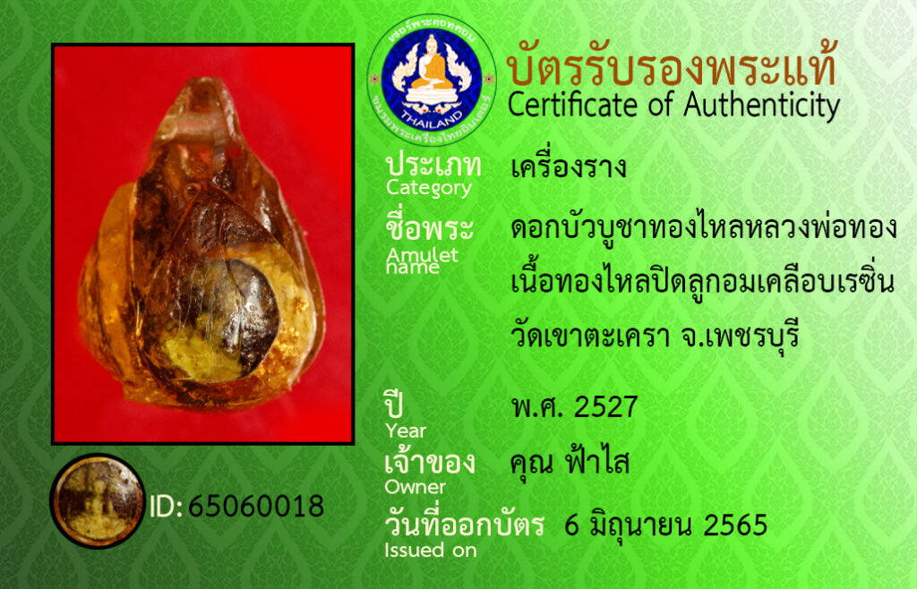 ชื่อพระ : ดอกบัวบูชาทองไหลหลวงพอทอง เนื้อทองไหลปิดลูกอมเคลือบเรซิ่น วัดเขาตะเครา จ.เพชรบุรี