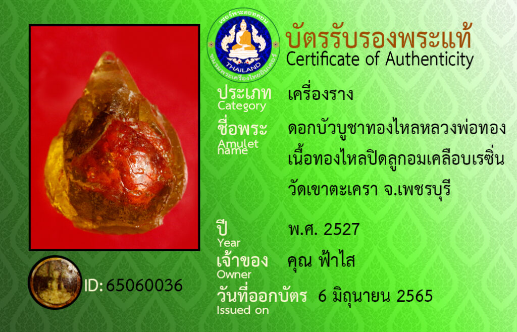 ชื่อพระ : ดอกบัวบูชาทองไหลหลวงพอทอง เนื้อทองไหลปิดลูกอมเคลือบเรซิ่น วัดเขาตะเครา จ.เพชรบุรี