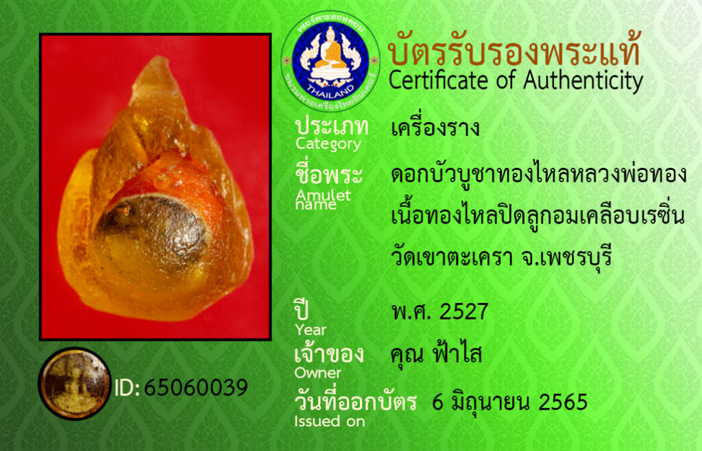 ชื่อพระ : ดอกบัวบูชาทองไหลหลวงพอทอง เนื้อทองไหลปิดลูกอมเคลือบเรซิ่น วัดเขาตะเครา จ.เพชรบุรี