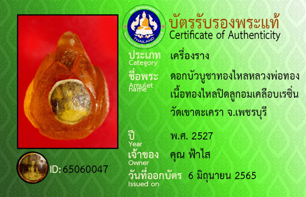 ชื่อพระ : ดอกบัวบูชาทองไหลหลวงพอทอง เนื้อทองไหลปิดลูกอมเคลือบเรซิ่น วัดเขาตะเครา จ.เพชรบุรี
