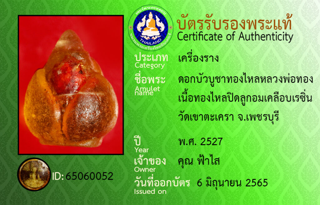 ชื่อพระ : ดอกบัวบูชาทองไหลหลวงพอทอง เนื้อทองไหลปิดลูกอมเคลือบเรซิ่น วัดเขาตะเครา จ.เพชรบุรี