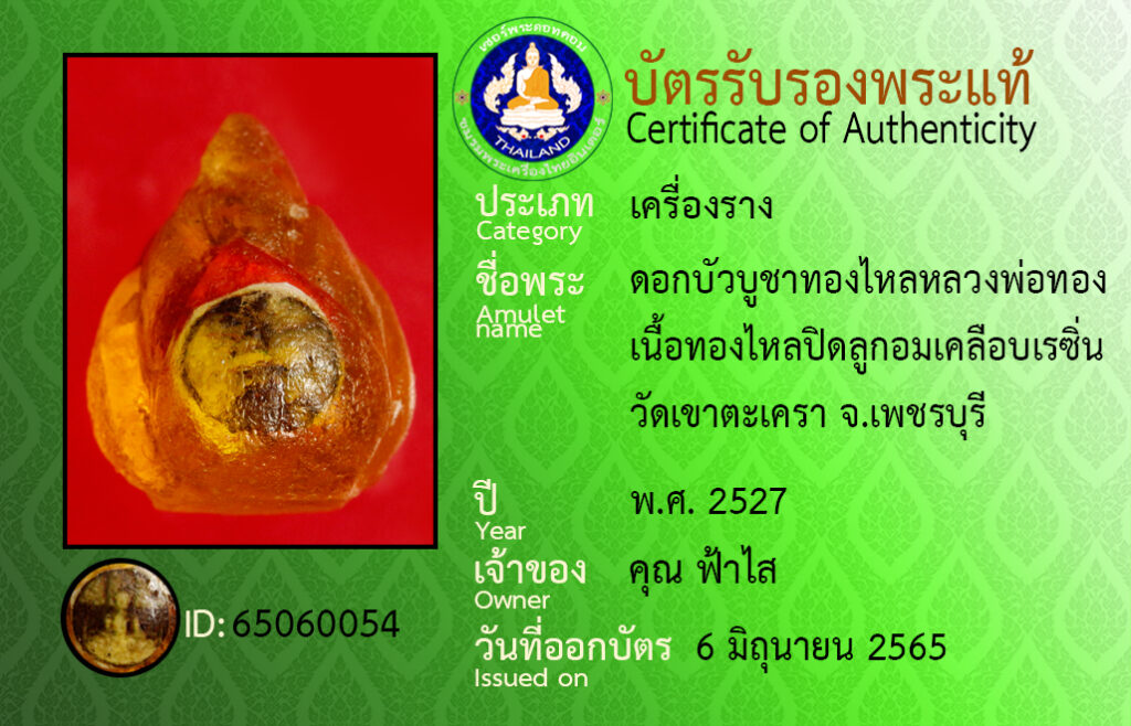 ชื่อพระ : ดอกบัวบูชาทองไหลหลวงพอทอง เนื้อทองไหลปิดลูกอมเคลือบเรซิ่น วัดเขาตะเครา จ.เพชรบุรี