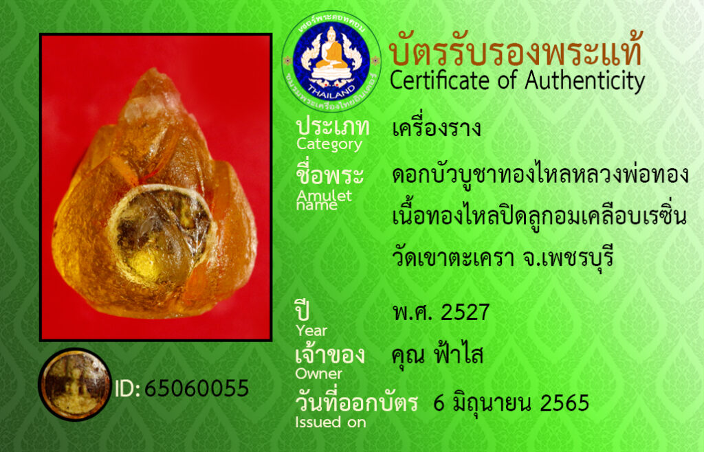 ชื่อพระ : ดอกบัวบูชาทองไหลหลวงพอทอง เนื้อทองไหลปิดลูกอมเคลือบเรซิ่น วัดเขาตะเครา จ.เพชรบุรี