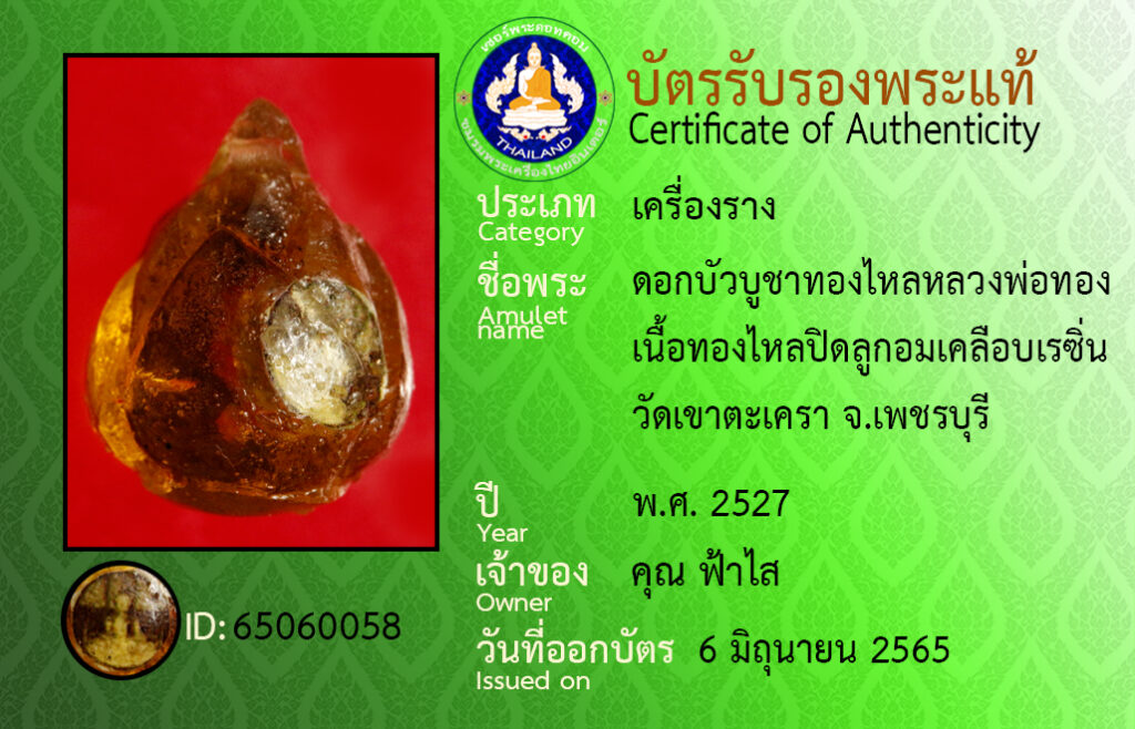 ชื่อพระ : ดอกบัวบูชาทองไหลหลวงพอทอง เนื้อทองไหลปิดลูกอมเคลือบเรซิ่น วัดเขาตะเครา จ.เพชรบุรี