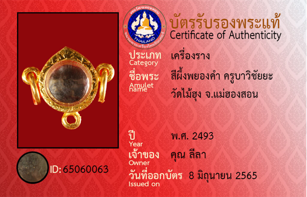 ชื่อพระ : สีผึ้งพยองคำ ครูบาวิชัยยะ วัดไม้ฮุง จ.แม่ฮองสอน