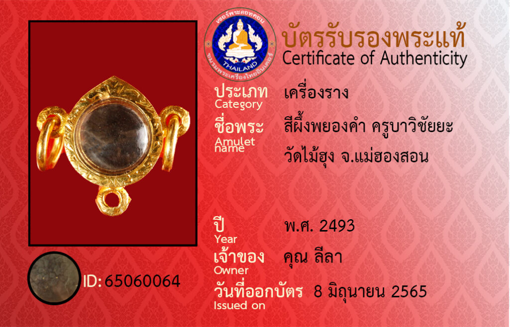ชื่อพระ : สีผึ้งพยองคำ ครูบาวิชัยยะ วัดไม้ฮุง จ.แม่ฮองสอน
