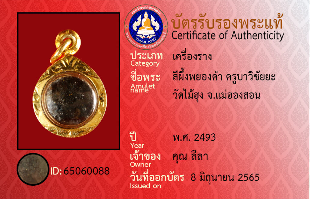 ชื่อพระ : สีผึ้งพยองคำ ครูบาวิชัยยะ วัดไม้ฮุง จ.แม่ฮองสอน