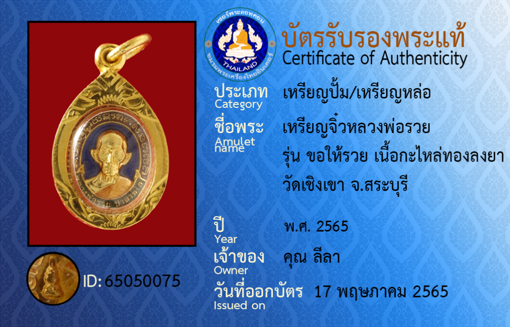 ชื่อพระ : เหรียญจิ๋วหลวงพ่อรวย รุ่น ขอให้รวย เนื้อกะไหล่ทองลงยา วัดเชิงเขา จ.สระบุรี