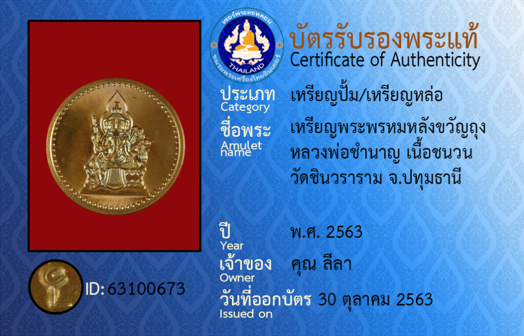 ชื่อพระ : เหรียญพระพรหมหลังขวัญถุง หลวงพ่อชำนาญ เนื้อชนวน วัดชินวราราม จ.ปทุมธานี
