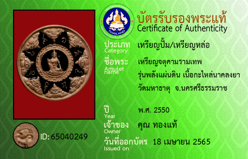 Amulet name : Rian Chatu Kham Ram Thep, Run Phalang Phaendin, Nuea Ka Lai Nak Long Ya ,Wat MahaThat Cho, Nakhon Si Thammarat