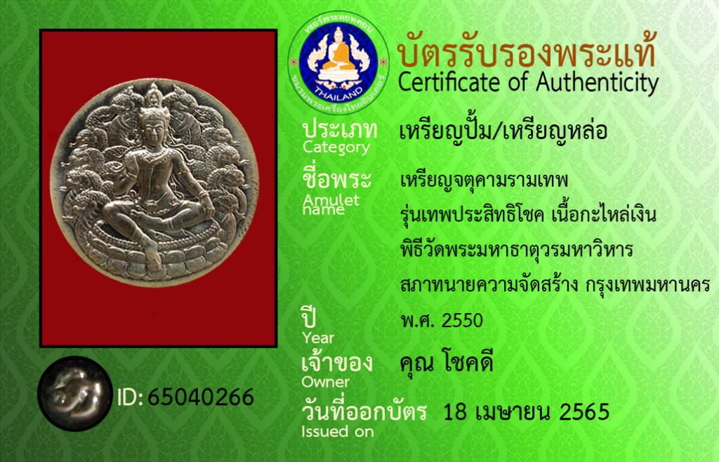 ชื่อพระ : เหรียญจตุคามรามเทพ รุ่นเทพประสิทธิโชค เนื้อกะไหล่เงิน พิธีวัดพระมหาธาตุวรมหาวิหาร สภาทนายความจัดสร้าง กรุงเทพมหานคร
