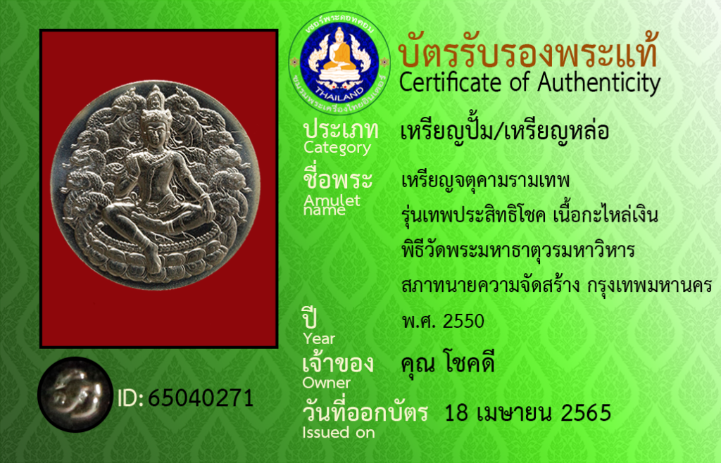 Amulet name : Rian Chatu Kham Ram Thep, Run Thep Pra SitthiChok ,Nuea Ka Lai Ngoen, Phithi Wat Phra Mahathat Woramahawihan ,Sapha Thanaikhwam Chat Sang, Krungthepmahanakhon