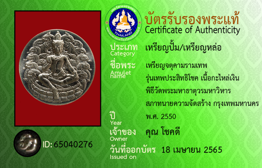 ชื่อพระ : เหรียญจตุคามรามเทพ รุ่นเทพประสิทธิโชค เนื้อกะไหล่เงิน พิธีวัดพระมหาธาตุวรมหาวิหาร สภาทนายความจัดสร้าง กรุงเทพมหานคร