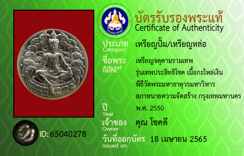 Amulet name : Rian Chatu Kham Ram Thep, Run Thep Pra SitthiChok ,Nuea Ka Lai Ngoen, Phithi Wat Phra Mahathat Woramahawihan ,Sapha Thanaikhwam Chat Sang, Krungthepmahanakhon