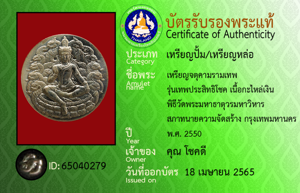 Amulet name : Rian Chatu Kham Ram Thep, Run Thep Pra SitthiChok ,Nuea Ka Lai Ngoen, Phithi Wat Phra Mahathat Woramahawihan ,Sapha Thanaikhwam Chat Sang, Krungthepmahanakhon