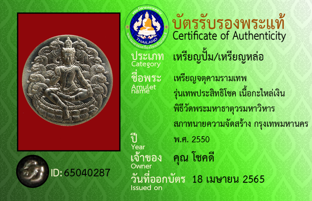 ชื่อพระ : เหรียญจตุคามรามเทพ รุ่นเทพประสิทธิโชค เนื้อกะไหล่เงิน พิธีวัดพระมหาธาตุวรมหาวิหาร สภาทนายความจัดสร้าง กรุงเทพมหานคร