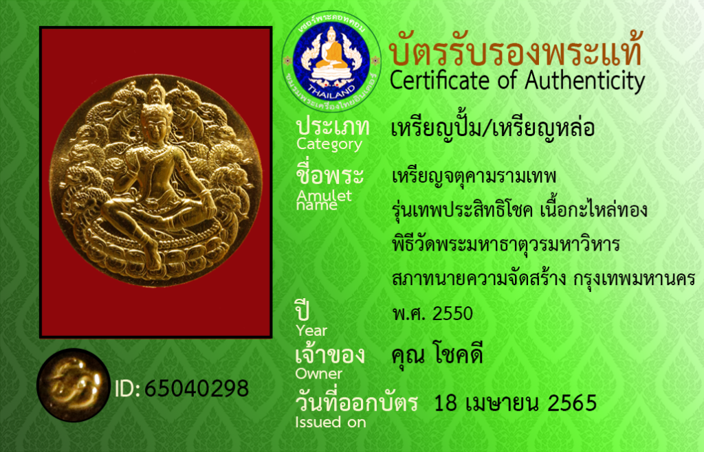 Amulet name : Rian Chatu Kham Ram Thep, Run Thep Pra SitthiChok,Nuea Ka Lai Thong Phithi ,Wat Phra Mahathat Woramahawihan Sapha Thanaikhwam Chat Sang,Krungthepmahanakhon