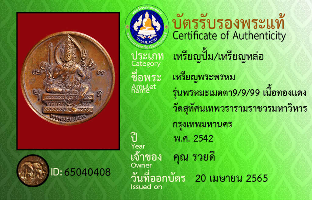 ชื่อพระ : เหรียญพระพรหม รุ่นพรหมะเมตตา9/9/99 เนื้อทองแดง วัดสุทัศนเทพวรารามราชวรมหาวิหาร กรุงเทพมหานคร