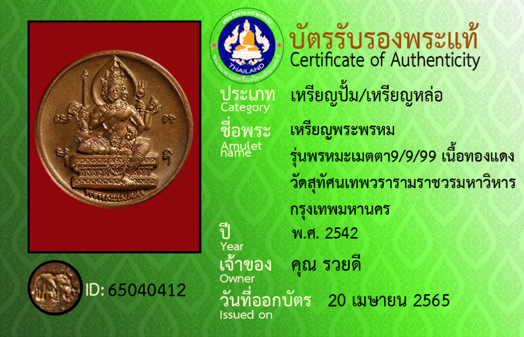 Amulet name : Rian Phra Phrom, Run Phon Ma Metta 9/9/99],Nuea Thongdaeng ,Wat Su Thatsana Thep Wara Ram Ratchaworamahawihan, Krungthepmahanakhon