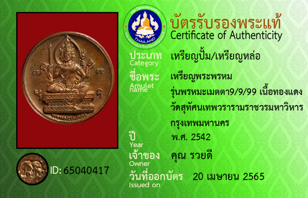 ชื่อพระ : เหรียญพระพรหม รุ่นพรหมะเมตตา9/9/99 เนื้อทองแดง วัดสุทัศนเทพวรารามราชวรมหาวิหาร กรุงเทพมหานคร