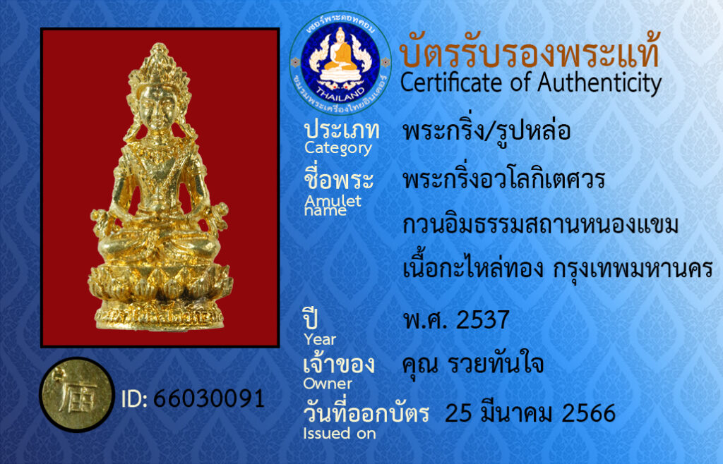 ชื่อพระ :พระกริ่งอวโลกิเตศวร กวนอิมธรรมสถานหนองแขม เนื้อกะไหล่ทอง กรุงเทพมหานคร