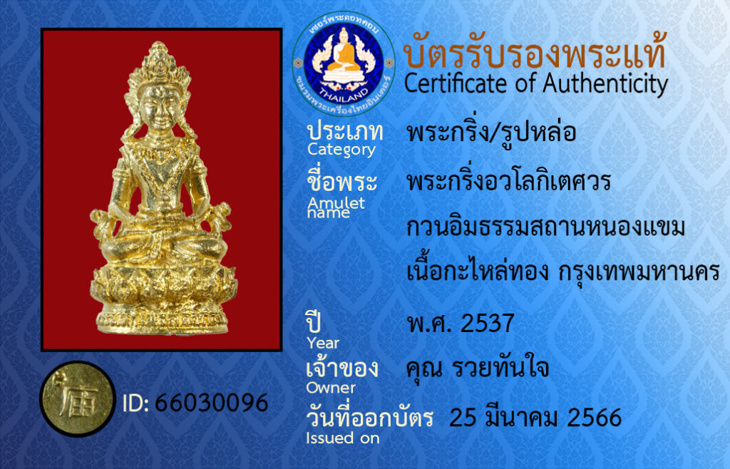 ชื่อพระ :พระกริ่งอวโลกิเตศวร กวนอิมธรรมสถานหนองแขม เนื้อกะไหล่ทอง กรุงเทพมหานคร