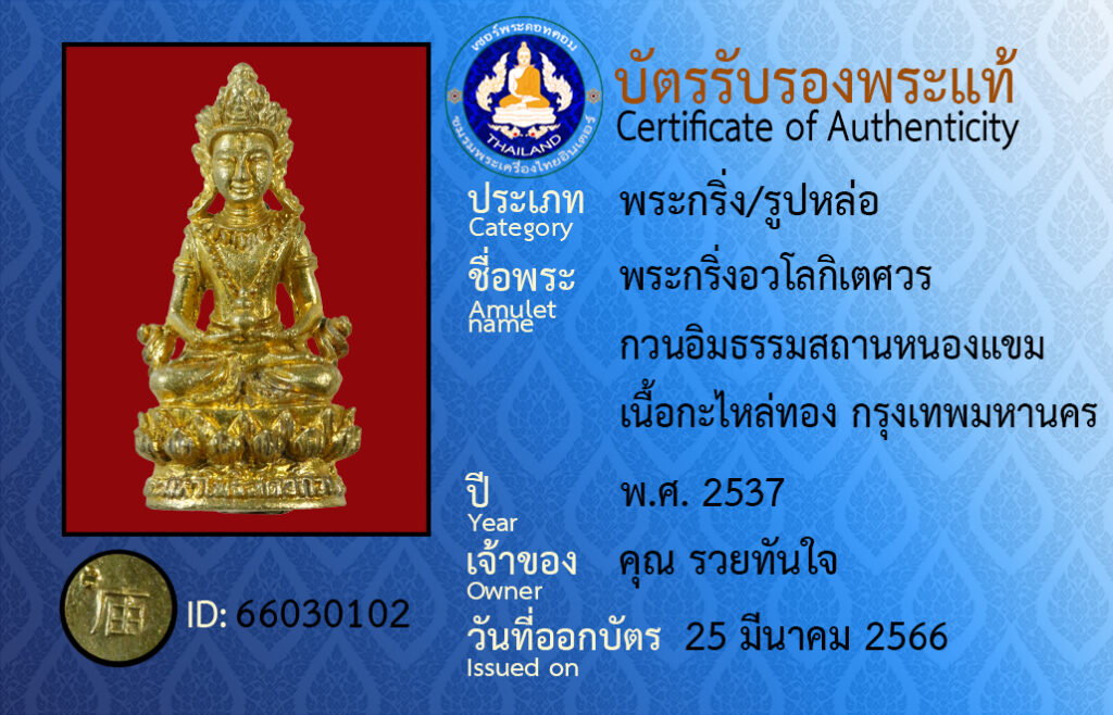 ชื่อพระ :พระกริ่งอวโลกิเตศวร กวนอิมธรรมสถานหนองแขม เนื้อกะไหล่ทอง กรุงเทพมหานคร