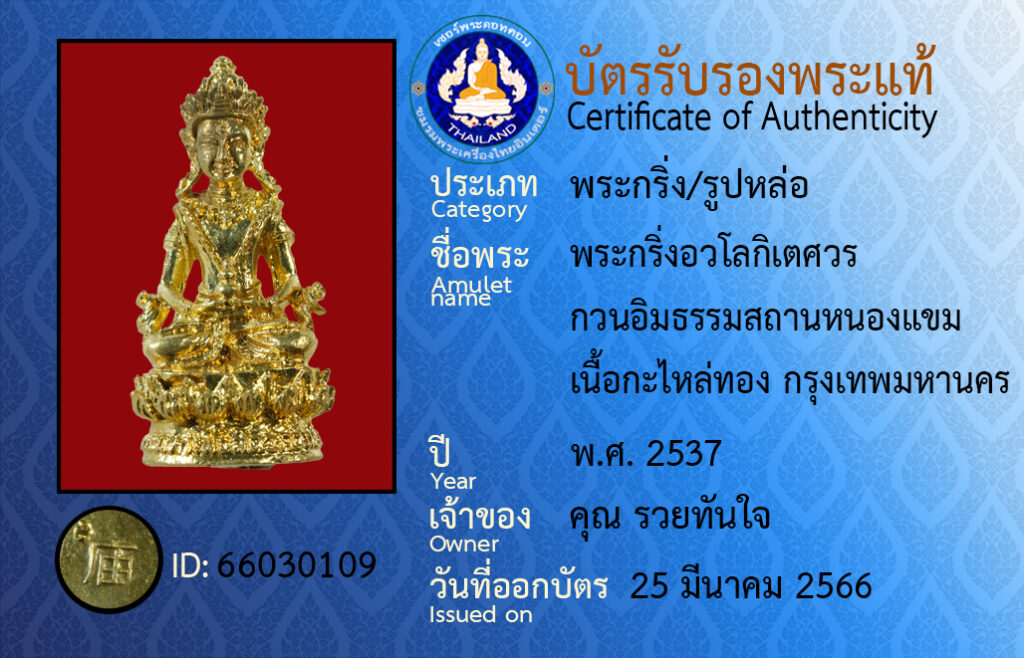 ชื่อพระ :พระกริ่งอวโลกิเตศวร กวนอิมธรรมสถานหนองแขม เนื้อกะไหล่ทอง กรุงเทพมหานคร