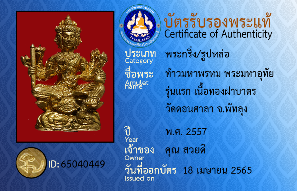 ชื่อพระ : ท้าวมหาพรหม พระมหาอุทัย รุ่นแรก เนื้อทองฝาบาตร วัดดอนศาลา จ.พัทลุง