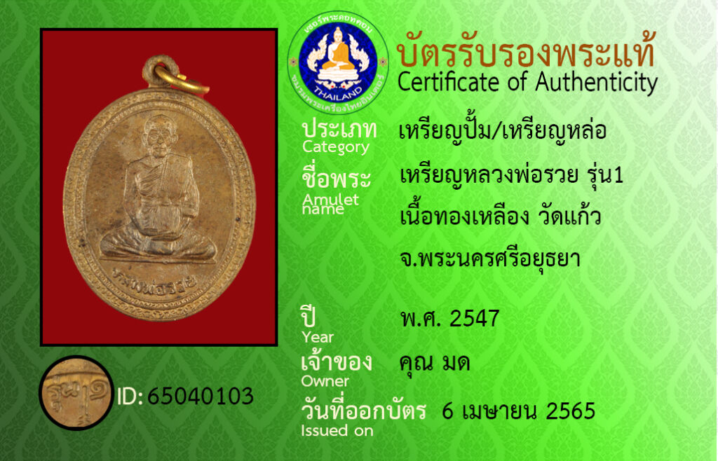 ชื่อพระ : เหรียญหลวงพ่อรวย รุ่น1 เนื้อทองเหลือง วัดแก้ว จ.พระนครศรีอยุธยา