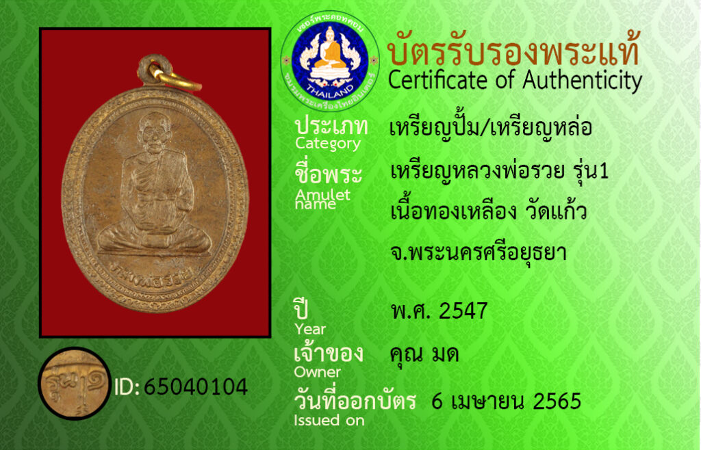ชื่อพระ : เหรียญหลวงพ่อรวย รุ่น1 เนื้อทองเหลือง วัดแก้ว จ.พระนครศรีอยุธยา