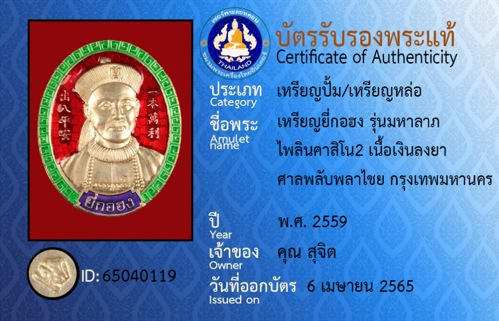 ชื่อพระ : เหรียญยี่กอฮง รุ่นมหาลาภ ไพลินคาสิโน2 เนื้อเงินลงยา ศาลพลับพลาไชย กรุงเทพมหานคร